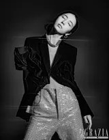 赵丽颖轻倚墙面,姿态放松而优雅,裙摆的褶皱如水银泻地,她嘴角含着一丝若有若无的笑意,展现了动静皆宜的迷人风采。